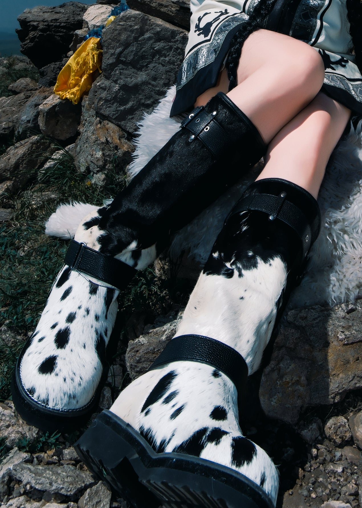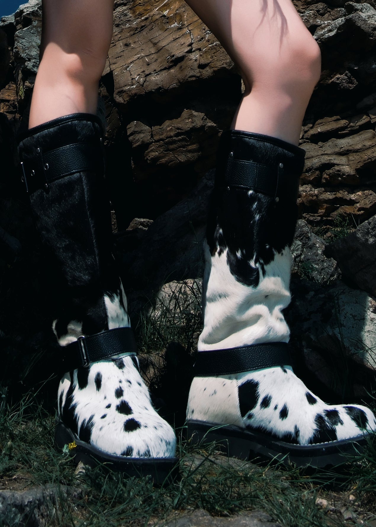 Experience the bold spirit of Mogski with our “The Black Stallion Cowhide Boots,” a striking blend of handcrafted winter boots and women’s winter footwear that marries timeless sophistication with rugged performance. These designer winter boots are meticulously fashioned from natural, black-and-white hair-on-hide cowhide, ensuring each pair boasts one-of-a-kind patterns. The sturdy black leather straps and gleaming silver buckles not only accentuate their equestrian-inspired design—reminiscent of the powerful Mongolian horses that roam the steppes—but also provide a secure, adjustable fit.